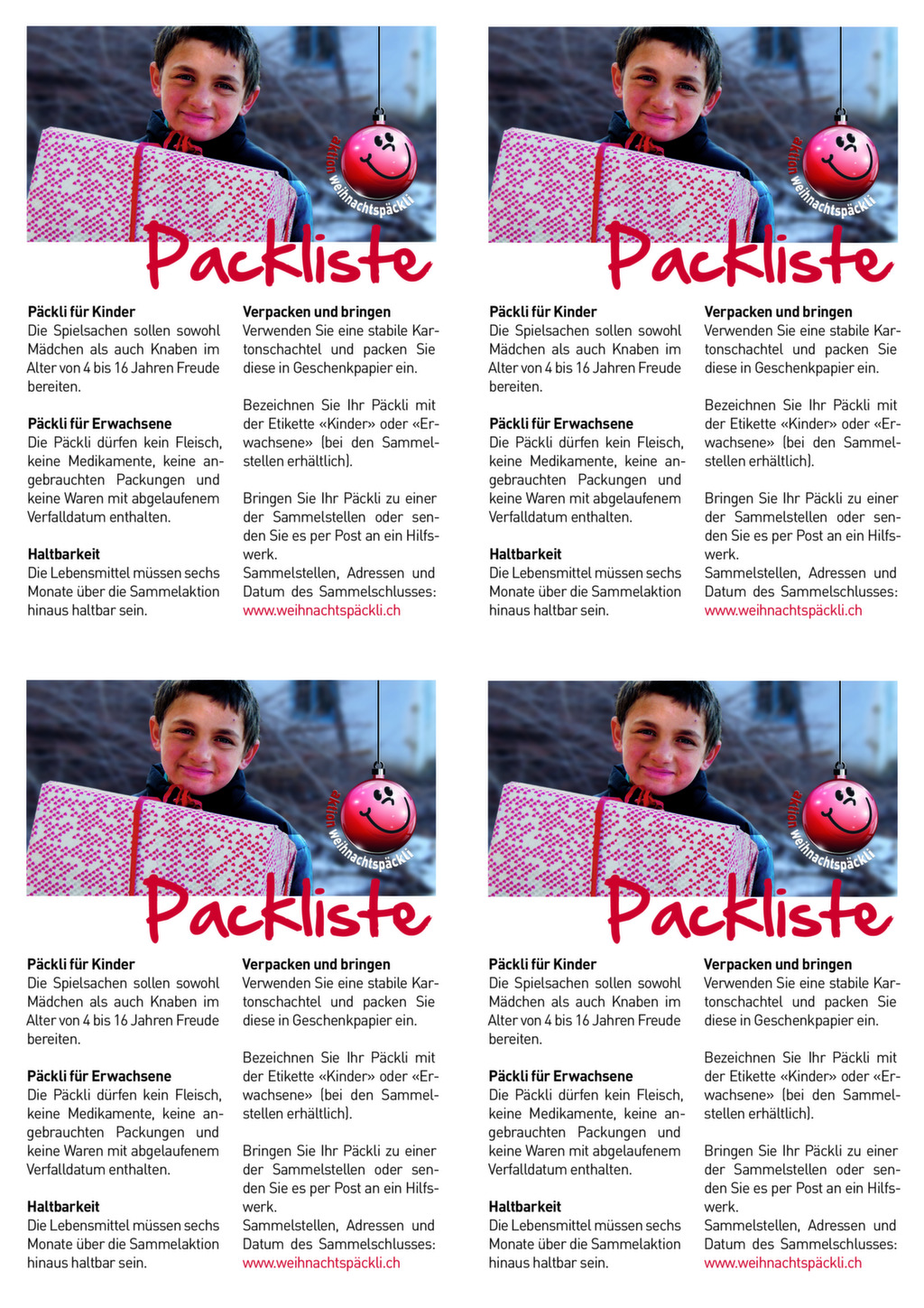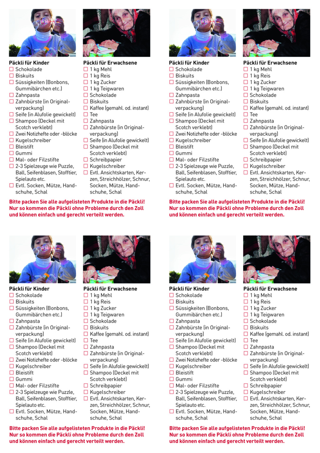 Hier die Materialliste für ein Päckli (Seite 2! – Kinder und Erwachsenenpakete):