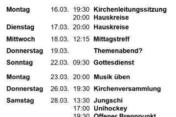 Hier der Link zum Brennpunkt-Info mit Monats-Programm. Am zweiten Sonntag im Monat haben wir keinen Gottesdienst. Wir feiern dann Chile bi de Lüüt. Bitte beachten sie unsere Datenschutzerklärung nach dem Datenschutzgesetz (DSG)
