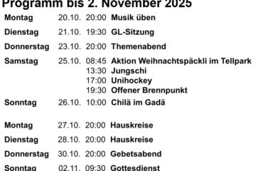 Chile bi de Lüüt – ist kein Programm, sondern eine Zeit am zweiten Sonntag im Monat, in der wir als Kirche etwas unternehmen, das wir gerne machen, bzw. sowieso tun würden. Mit Menschen zusammen sein, die wir lieben und anderen Menschen die Möglichkeit geben, an unserer Gemeinschaft teilzuhaben. Wenn eine Weiterlesen…