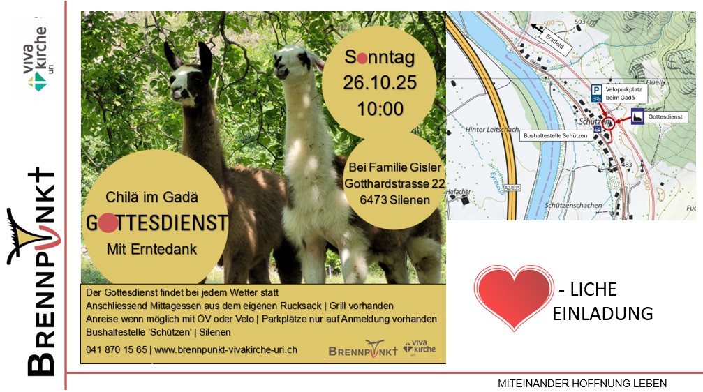 Hier der Link zum Brennpunkt-Info mit Monats-Programm. Am zweiten Sonntag im Monat haben wir keinen Gottesdienst. Wir feiern dann Chile bi de Lüüt. Bitte beachten sie unsere Datenschutzerklärung nach dem Datenschutzgesetz (DSG)